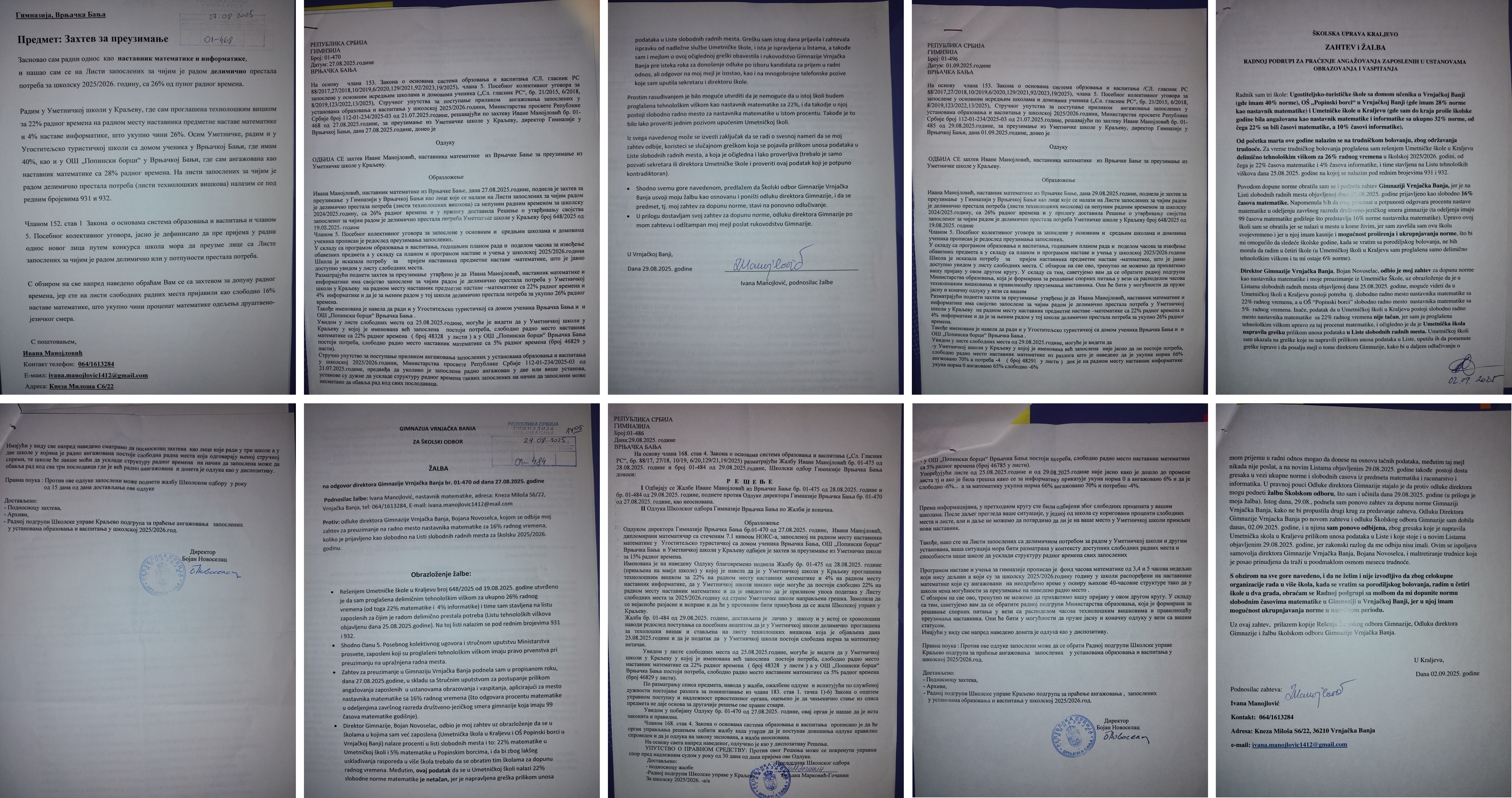 Ivana Manojlović je tokom trudničkog bolovanja nezakonito proglašena tehnološkim viškom u Umetničkoj školi u Kraljevu, a zatim sprečena da ostvari dopunu norme u Gimnaziji u Vrnjačkoj Banji zbog administrativnih grešaka koje nadležne institucije odbijaju da isprave.