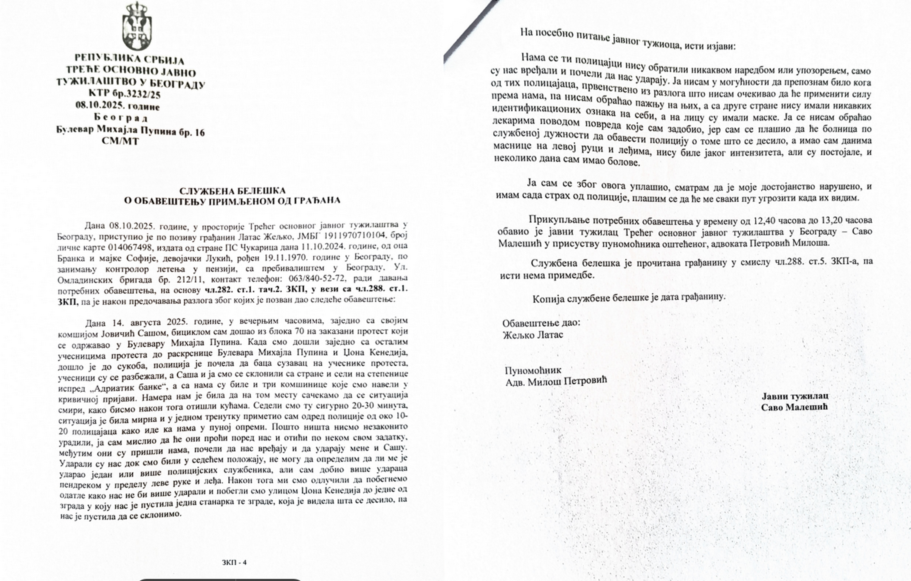 Željko Latas iz Novog Beograda napadnut je od strane policijskih službenika, a ceo incident zabeležen je sigurnosnim kamerama ispred Adriatik banke i potvrđen svedočenjima očevidaca.