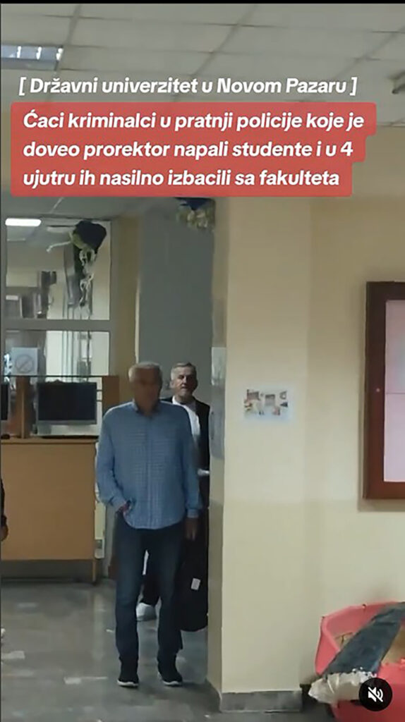 Studenti navode da su napadači ušli uz povike „Požar, svi hitno napolje“ i da je u akciji učestvovalo privatno obezbeđenje iz Kraljeva (Insajder).